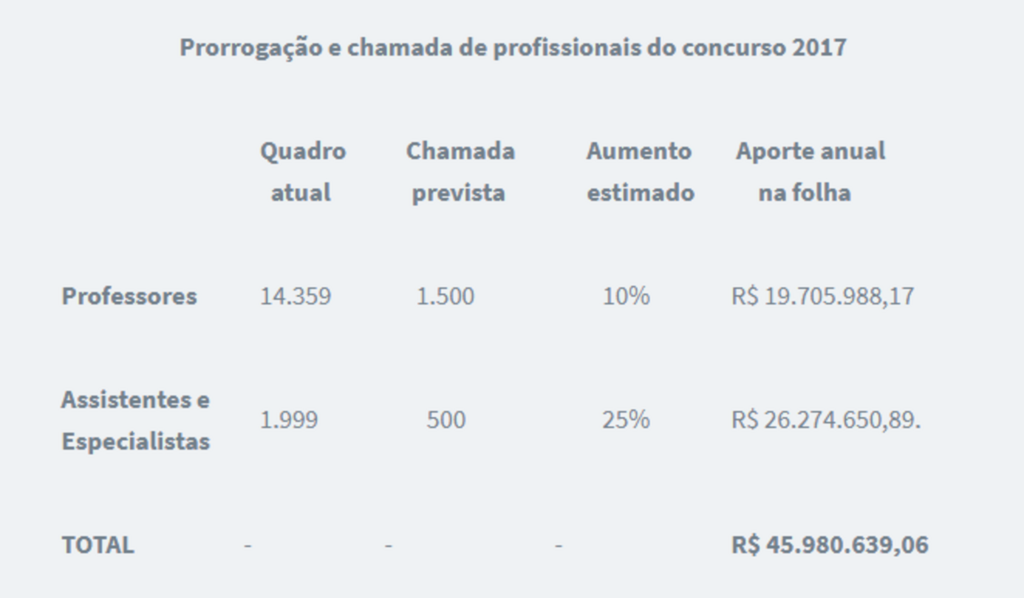 A prorrogação do concurso 2017 e a chamada de novos profissionais para o magistério reflete o empenho do Estado com a melhoria da qualidade na educação e a busca pelo cumprimento da legislação específica. A chamada de professores atende ao Plano Estadual de Educação, enquanto a contratação dos especialistas e assistentes é prevista por lei complementar.