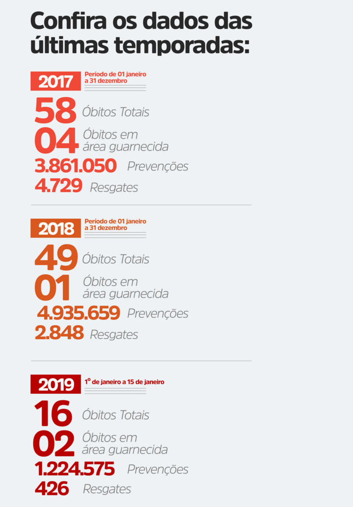 Considerando o ano de 2018 (1/jan - 31/dez), foram registrados 49 óbitos. Dessas mortes, 34 foram em água doce e em áreas sem guarda-vidas. No mar, foram 15, sendo que apenas uma morte foi em local com a presença da corporação. Isso graças ao intenso trabalho de prevenção realizado pelo Corpo de Bombeiros.