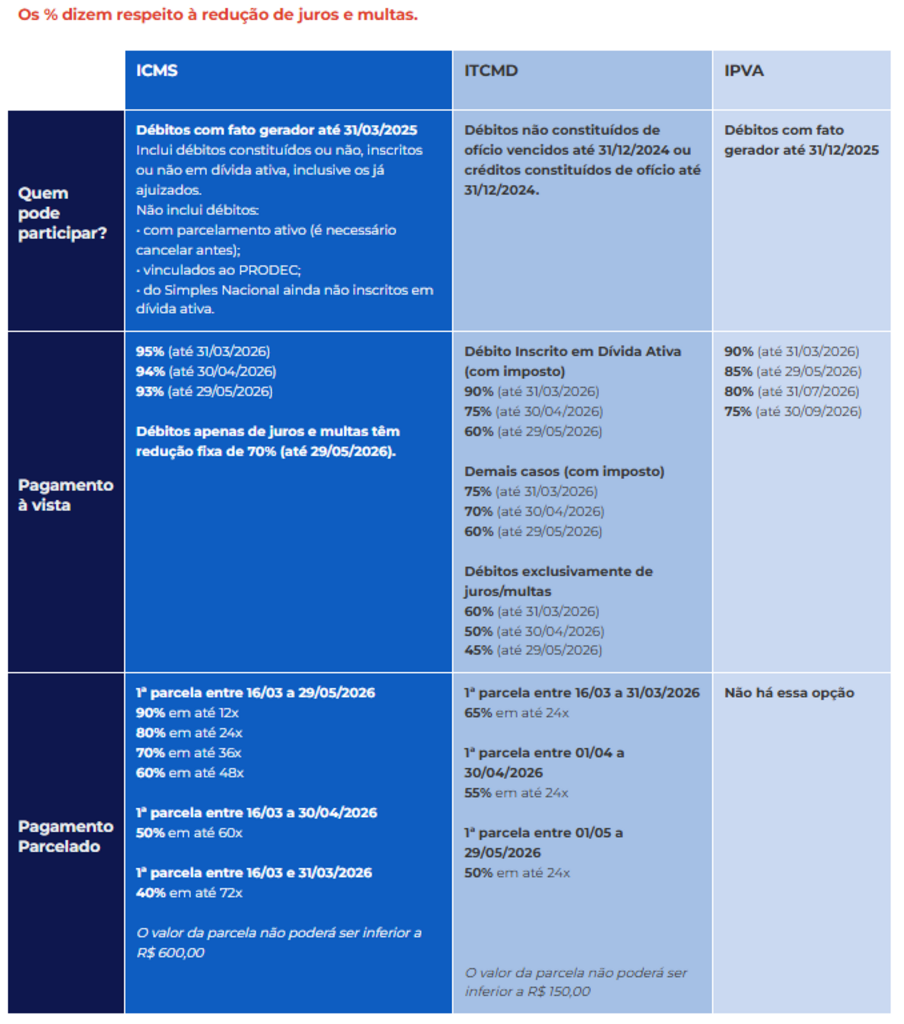 Para o ITCMD, os descontos variam entre 45% e 90%, com possibilidade de parcelamento em até 24 vezes. Já o IPVA terá redução entre 75% e 90% sobre multas e juros, mas as condições são exclusivas para pagamento à vista.A negociação envolve débitos de ICMS gerados até 31 de março de 2025 (confira a tabela abaixo para verificar as opções para o IPVA e ITCMD). A expectativa do Governo do Estado é recuperar até R$ 1 bilhão somente com débitos de ICMS.