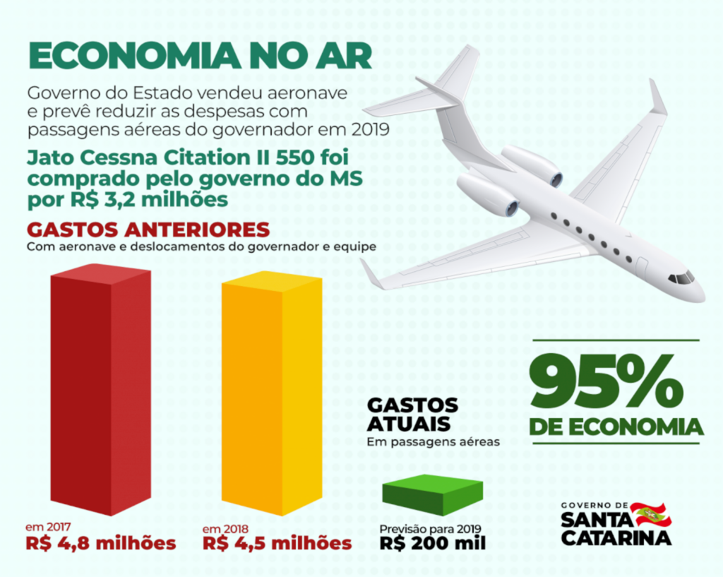 A venda de uma aeronave e a compra de passagens em voos comerciais irão representar uma economia de 95% com os deslocamentos do governador Carlos Moisés, conforme levantamento da Casa Civil do Estado de Santa Catarina. Ao abrir mão do jato Cessna Citation II 550, o chefe do Executivo deixará de gastar até R$ 4,5 milhões por ano. O avião foi comprado pelo Governo de Mato Grosso do Sul por cerca de R$ 3,2 milhões. O contrato foi publicado no Diário Oficial desta segunda-feira, 9.